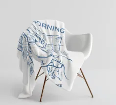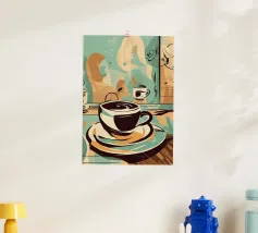 Handgezeichnete Küche mit Espressomaschine und einer Tasse Kaffee in Blau und Weiß.