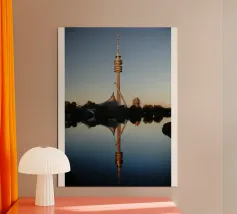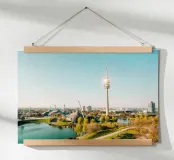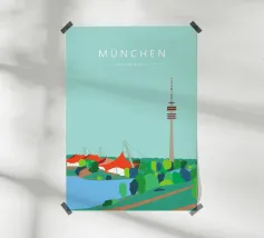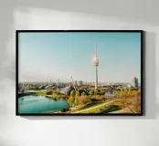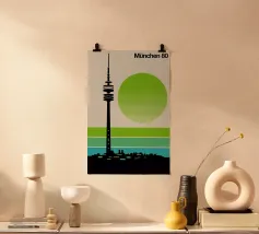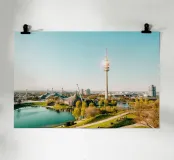 Blick vom Olympiaberg auf den Münchner Olympiapark mit Fernsehturm an einem sonnigen Sommertag. Im Vordergrund sitzen Menschen auf der Wiese, dahinter spiegeln sich die geschwungenen Zeltdächer im See. Ein warmes, modernes Stadtmotiv aus München mit klaren Farben und Sommerfeeling.