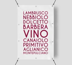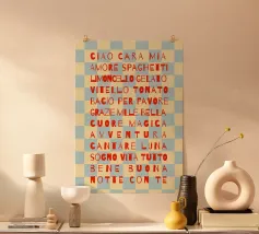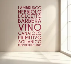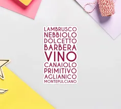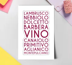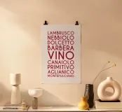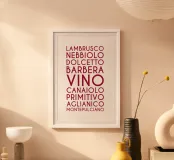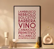 Ein visuelles Weinlexikon in vertikaler Rhythmik: Das zentrale Wort „VINO“ steht groß und dominant im Zentrum – wie ein Titel, ein Ausruf, ein Versprechen. Drumherum reihen sich neun italienische Rebsorten in dunklem Rot, alle in Großbuchstaben und gleichmäßiger Typografie: LAMBRUSCO, NEBBIOLO, DOLCETTO, BARBERA, CANAIOLA, PRIMITIVO, AGLIANICO, MONTEPULCIANO.Die vertikale Anordnung erzeugt eine rhythmische Spannung – wie ein Etikett, das zum Entdecken einlädt. Ideal für Weinliebhaber, Sommeliers oder als edukatives Design für Küche, Bar oder Weinladen.