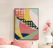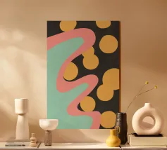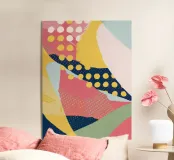 Eine dynamische und farbenfrohe abstrakte Collage mit sich überschneidenden Formen und verschiedenen Mustern, darunter Polka-Dots, Streifen und Volltonfarben, die ein fröhliches, energiegeladenes Gefühl vermitteln.