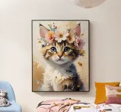 Dieses moderne Design zeigt ein kleines süßes Kätzchen mit Blüten auf dem Kopf. In zarten Aquarellfarben und mit goldenen Akzenten gestaltet, verbindet es natürliche Schönheit mit künstlerischer Eleganz. Die weichen Farbverläufe und der abstrakte Stil verleihen jedem Raum eine romantisch-verspielte und zugleich stilvolle Atmosphäre – ein echter Blickfang für Ihr Zuhause.