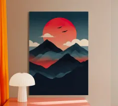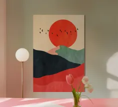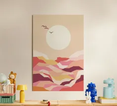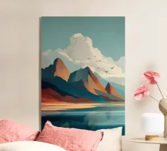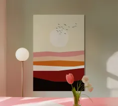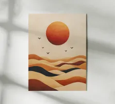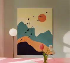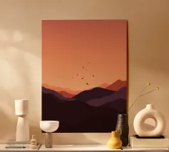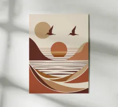 Eine heitere Landschaftsillustration mit Möwen, die über ein ruhiges Meer der untergehenden Sonne entgegenfliegen, mit Bergen im Hintergrund, alles in einer weichen, warmen Farbpalette.