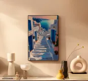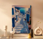 Eine heitere und malerische Darstellung der steilen, weiß getünchten Stufen von Santorin, die mit leuchtend blauen Türen, blühenden Blumen und warmem Sonnenlicht geschmückt sind. Jede Stufe spiegelt den Charakter der Insel wider und führt zum glitzernden Ägäischen Meer. Das Zusammenspiel von Licht, Schatten und farbigen Akzenten schafft eine eindrucksvolle Szene, die die Ruhe und den Charme der berühmtesten Insel Griechenlands hervorruft.
