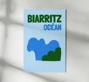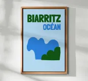 Lassen Sie sich von der Faszination des Atlantiks verzaubern mit diesem Reiseposter "Biarritz Océan", das in erfrischende Blau- und Grüntöne getaucht ist. Der fette grüne Text "BIARRITZ" und das blaue "OCÉAN" (Ozean) stehen über abstrakten, organischen Formen, die die rollenden Wellen und die üppige Küstenlandschaft von Biarritz darstellen. Dieses minimalistische, aber dennoch eindrucksvolle Design fängt die Essenz dieses berühmten Surfreviers an der baskischen Küste ein. Dieser hochwertige Digitaldruck mit einer beeindruckenden Auflösung von 7000x5000 Pixeln bei 300 DPI ist perfekt geeignet, um jedem Raum einen Hauch von ruhigem Küstencharme und Fernweh zu verleihen und garantiert eine außergewöhnliche Klarheit.