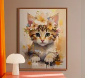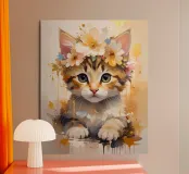 Dieses moderne Design zeigt ein kleines süßes Kätzchen mit Blüten auf dem Kopf. In zarten Aquarellfarben und mit goldenen Akzenten gestaltet, verbindet es natürliche Schönheit mit künstlerischer Eleganz. Die weichen Farbverläufe und der abstrakte Stil verleihen jedem Raum eine romantisch-verspielte und zugleich stilvolle Atmosphäre – ein echter Blickfang für Ihr Zuhause.