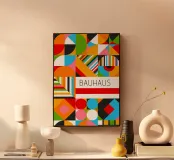 Dieses maximalistische Poster ist eine Explosion von Farben und Formen und zelebriert die geometrischen Prinzipien des Bauhauses mit einer energiegeladenen, modernen Wendung. Das Kunstwerk zeigt eine dichte, gekachelte Komposition aus Quadraten, Kreisen, Dreiecken und Streifen in einer reichen, lebendigen Farbpalette mit leuchtendem Grün, Orange, Pink, Rot und Blau. Das dynamische Arrangement umfasst solide Blöcke und gemusterte Bereiche, die von einem sauberen weißen Streifen mit dem Wort "BAUHAUS" zentriert werden. Diese hochauflösende digitale Datei (7000x5000 Pixel, 300 dpi) garantiert einen visuell beeindruckenden und professionellen Kunstdruck, der die Aufmerksamkeit auf sich zieht.