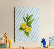 Ein raffiniertes und erfrischendes Poster mit einer detaillierten Aquarellillustration eines frischen Zitronenzweigs mit zwei leuchtend gelben Zitronen und sattgrünem Laub. Das botanische Mittelstück steht vor einem dynamischen und fröhlichen maximalistischen Hintergrund aus klaren hellblauen und weißen vertikalen Streifen, die alle mit einer weichen, strukturierten, malerischen Oberfläche versehen sind. Die klassische blau-gelbe Kombination ist perfekt für eine helle, küstennahe oder mediterrane Ästhetik. Dieses hochwertige Digitalposter (7000x5000 Pixel, 300 dpi) garantiert die satten, gemischten Farben der Aquarellfrüchte und die strukturierte