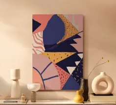 Eine abstrakte Collage aus zerbrochenen, sich überlagernden Formen in einer leuchtenden Farbpalette aus Orange, Blau und Rosa bildet eine dynamische, energiegeladene und moderne Komposition.
