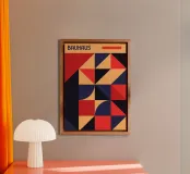 Ein lebendiges und komplexes Bauhaus-Plakat, das ein dichtes geometrisches Mosaik zeigt. Das Design besteht aus ineinandergreifenden Quadraten, Dreiecken und Viertelkreisen, die ein dynamisches, fast dreidimensionales Muster ergeben. Die kräftige Farbpalette umfasst Primärrot, tiefes Marineblau und warmes Pfirsich/Orange. Auf der Oberseite befindet sich der Text 'BAUHAUS' und ein roter horizontaler Balken, der ein klares modernistisches Layout schafft. Diese hochwertige digitale Posterdatei (7000x5000 Pixel, 300 dpi) bietet tadellose Schärfe und satte Farbsättigung für einen Druck in Galeriequalität.