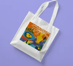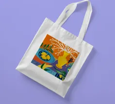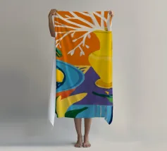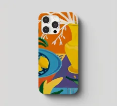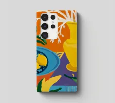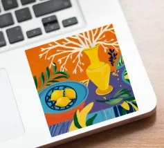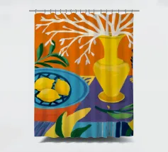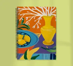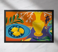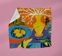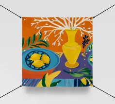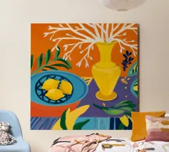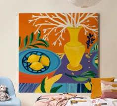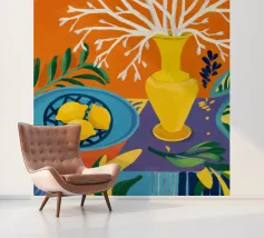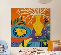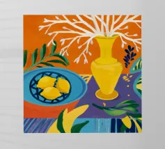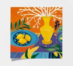 Ein Stillleben mit Zitronen in einer blauen Schale, die auf einem reichhaltigen violetten Tuch ruht. Dahinter steht eine hohe gelbe Vase mit weißen Zweigen vor einem feurig orangefarbenen Hintergrund, der eine kontrastreiche, farbenfrohe Szene erzeugt.