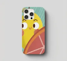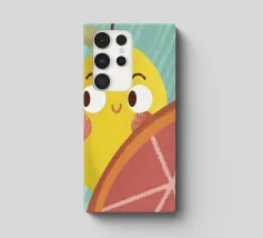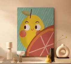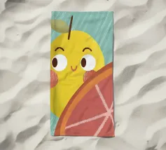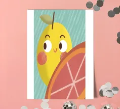 Die fröhliche Illustration zeigt eine lächelnde gelbe Zitronenfigur neben einer Orangenscheibe.