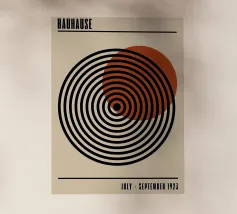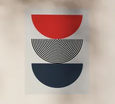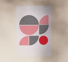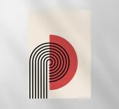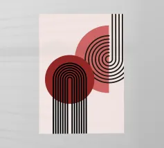 Mit diesem auffälligen abstrakten Kunstdruck verschmelzen Retro- und Modernismus-Ästhetik. Das Design zeigt einen kühnen roten Halbkreis, der einer komplexen Anordnung von schwarzen konzentrischen Bögen und parallelen Linien gegenübergestellt wird, wodurch eine visuell überzeugende und dynamische Komposition entsteht, die an das Grafikdesign der 70er Jahre erinnert. Dieses Stück verkörpert sowohl einen verspielten Retro-Charme als auch ein klares, modernes Gefühl. Mit einer beeindruckenden Auflösung von 7000x5000 Pixeln und einer Auflösung von 300 dpi stellt dieses hochwertige Digitalkunstwerk sicher, dass jede scharfe Linie und jeder leuchtende Farbton mit außergewöhnlicher Präzision wiedergegeben wird, was es zu einer überzeugenden Ergänzung für