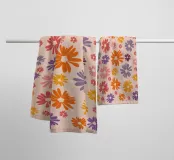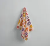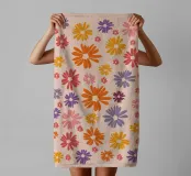 Ein verspieltes Blumenmuster, das wie ein visueller Spaziergang durch ein Retro-Gartenfestival wirkt: Die stilisierten Blüten – in Orange, Pink, Lila, Rot und Gelb – tanzen frei. Jede Blume hat eine einfache, margeritenartige Form mit langen, strahlenförmigen Blütenblättern, die aus einem zentralen Punkt hervorgehen. Die Anordnung ist bewusst unregelmäßig – wie ein Streumuster aus Freude, Sommer und Nostalgie.
