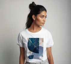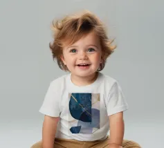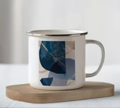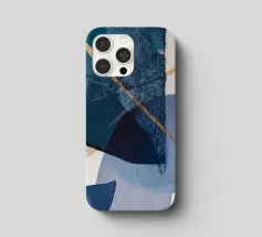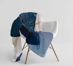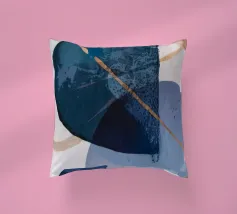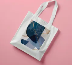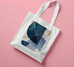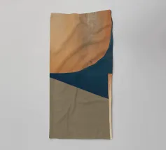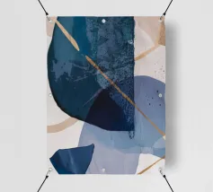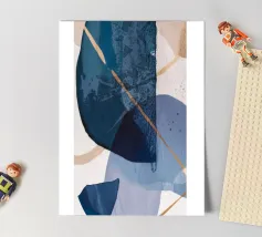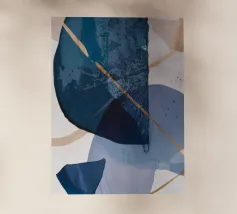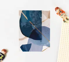 Weiche geometrische Formen in kühlem Blau und Hellbraun halten sich in abstrakter Ruhe die Waage.