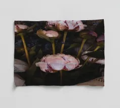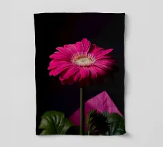 Ein spiralgebundenes Notizbuch mit drei rosafarbenen Blumen und grünen Blättern auf einer bunten Holzoberfläche lädt zu Kreativität und Inspiration ein.