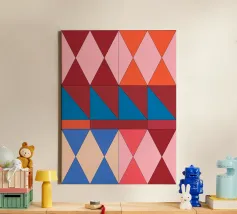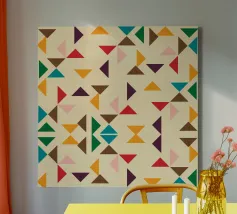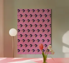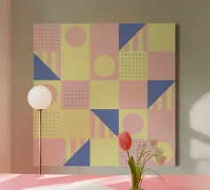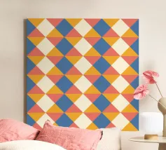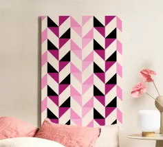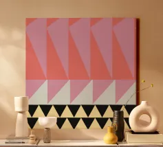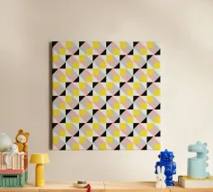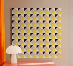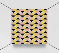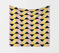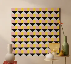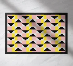 Geometrische Muster wiederholen sich in einem symmetrischen Design, das Dreiecke und Rechtecke in Schwarz, Gelb und Rosa umfasst. Die strukturierte Anordnung schafft eine visuell auffällige und geordnete Komposition.