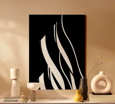 Das Kunstwerk zeigt eine Reihe von fließenden Wellenmustern, die ein Gefühl von Rhythmus und fließender Bewegung vor einem kontrastreichen dunklen Hintergrund vermitteln.