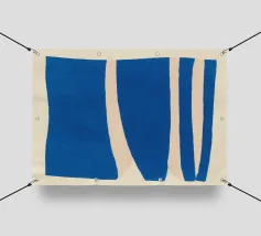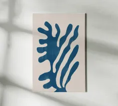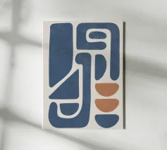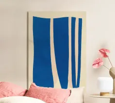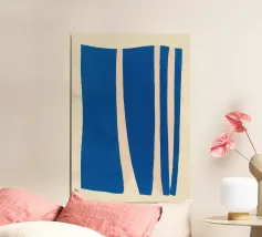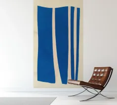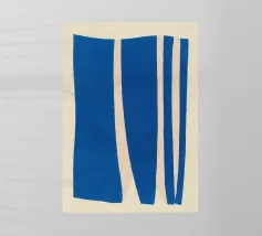 Minimalistisches Kunstwerk auf cremefarbenem Hintergrund mit vertikalen Elementen in Blau und Pfirsich. Blaue Flächen sind texturiert und matt, während Pfirsichbereiche dünn und glatt sind. Die Anordnung erzeugt Rhythmus und vertikale Bewegung, klare geometrische Formen prägen die Komposition.