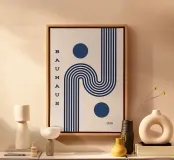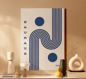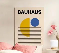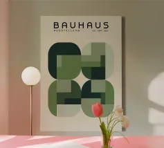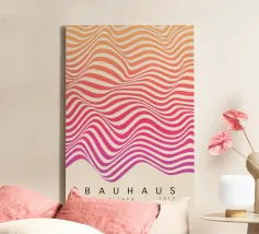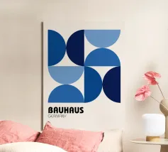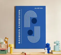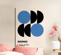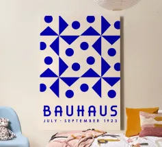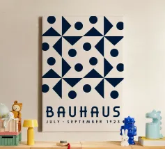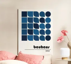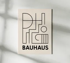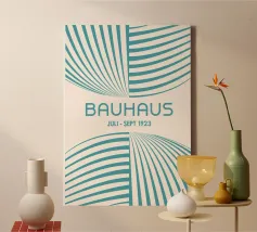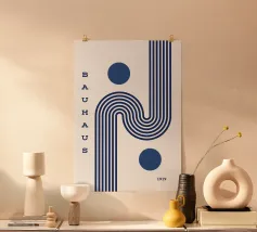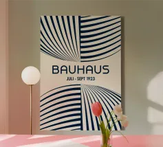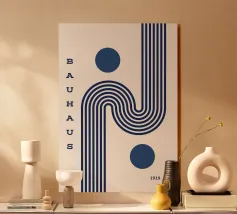 Ein eindrucksvolles Beispiel für das grafische Design des Bauhauses aus der frühen Zeit um 1919. Dieses minimalistische Plakat erzielt eine maximale Wirkung durch einfache, elegante Geometrie. Der Entwurf zeichnet sich durch kühne, parallele, tiefblaue Linien aus, die in eine rhythmische S-Kurve oder Wellenform münden, die durch zwei einfarbige blaue Kreise ausgeglichen wird. Diese kontrastreiche Komposition verkörpert den konstruktivistischen Fokus auf lineare Struktur und Bewegung und ist damit ein zeitloses Statement. Es eignet sich perfekt, um einem minimalistischen, skandinavischen oder Mid Century Modern-Raum einen modernistischen Rhythmus zu verleihen. Der Text lautet "BAUHAUS 1919". Dies ist eine hochwertige digitale Kunstreproduktion,