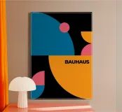 Ein kühnes und lebhaftes abstraktes Poster mit einer dynamischen, sich überschneidenden Komposition geometrischer Formen vor einem markanten schwarzen Hintergrund. Die Farbpalette umfasst elektrisches Blau, heißes Pink und leuchtendes Orange, die einen hohen Kontrast und visuelle Energie erzeugen. Große Halbkreise und Bögen dominieren den Rahmen, während kleinere kreisförmige Details die Aufmerksamkeit auf sich ziehen. Das Wort "BAUHAUS" ist in der unteren Hälfte in klaren, serifenlosen Buchstaben prominent platziert. Dieses Kunstwerk ist eine moderne Interpretation der geometrischen Abstraktion und der Designprinzipien der Moderne. Das hochauflösende digitale Format (7000x5000 Pixel,
