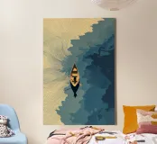 Eine einsame Figur schwebt zwischen Stille und Fluss. Drift Lines fängt den Moment ein, in dem Erkundung zur Meditation wird. Die scharfen grafischen Linien treffen auf fließende Farbverläufe und schaffen ein empfindliches Gleichgewicht zwischen Struktur und Ruhe. Von oben betrachtet, wird das Boot zum Symbol - für Richtung, Introspektion und Raum. Ideal für moderne Räume, die Klarheit, Minimalismus und einen Hauch von Poesie und Mystik suchen.