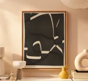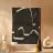 Eine abstrakte Komposition mit sich überschneidenden schwarzen Kurven und Linien auf beigem Hintergrund. Das Design spielt mit Kontrasten und geometrischen Formen, um ein Gleichgewicht zwischen Bewegung und Stille zu schaffen.