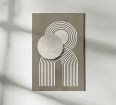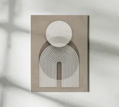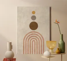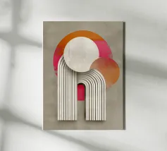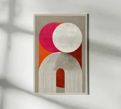 Diese abstrakte Bauhaus-Inspiration verbindet Geometrie und Symmetrie in einem modernen Design. Mit weißen Kreisen, Halbkreisen und Streifen in Grau, Orange und Pink schafft die Illustration ein harmonisches Farbspiel. Die retro Streifen-architektonischen Formen verleihen dem Kunstwerk eine minimalistische und strukturierte Ästhetik.
