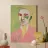 Ausdrucksstarkes Porträt mit feiner Linienzeichnung und Farbblöcken. Person mit dunklem Haar, hellem Teint und neutralem Ausdruck. Gesicht in Weiß mit grünen und roten Akzenten, rosa Kleidung mit weißem Kragen vor grün-gelbem Hintergrund. Harmonische Komposition voller Lebendigkeit.