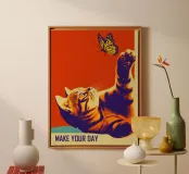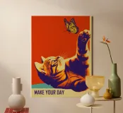 Dieses charmantes Motivationsposter kombiniert verspielte Fotografie mit Vintage-Ästhetik. Die intensive Zweifarbigkeit in leuchtendem Orange und tiefem Violett erinnert an psychedelische Siebdrucke der 1960er. Die neugierige Katze, die nach dem Monarchfalter greift, symbolisiert kindliche Freude und achtsames Erleben. Der Slogan "MAKE YOUR DAY" unterstreicht die positive Message ohne aufdringlich zu wirken. Die posterisierte Bildbearbeitung verleiht dem Werk grafische Klarheit. Ein Statement über Lebensfreude, Neugier und das Finden von Glück in kleinen Momenten – inspirierend und dekorativ.