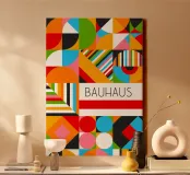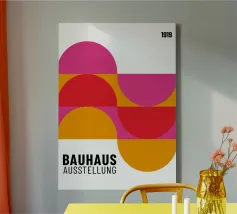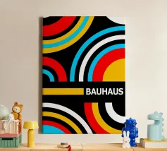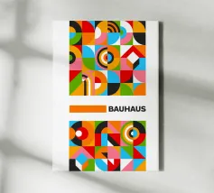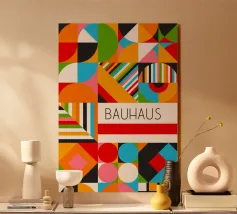 Dieses maximalistische Poster ist eine Explosion von Farben und Formen und zelebriert die geometrischen Prinzipien des Bauhauses mit einer energiegeladenen, modernen Wendung. Das Kunstwerk zeigt eine dichte, gekachelte Komposition aus Quadraten, Kreisen, Dreiecken und Streifen in einer reichen, lebendigen Farbpalette mit leuchtendem Grün, Orange, Pink, Rot und Blau. Das dynamische Arrangement umfasst solide Blöcke und gemusterte Bereiche, die von einem sauberen weißen Streifen mit dem Wort "BAUHAUS" zentriert werden. Diese hochauflösende digitale Datei (7000x5000 Pixel, 300 dpi) garantiert einen visuell beeindruckenden und professionellen Kunstdruck, der die Aufmerksamkeit auf sich zieht.