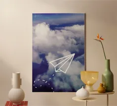 Papierflugzeug, das mit Schleppflug durch die Luft fliegt Leinwand