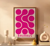 Ein auffallendes und modernes abstraktes Poster mit einem kontinuierlichen, organisch-geometrischen Muster, das als "Metaball" oder "Blob"-Kunst bekannt ist und in einem einzigen, intensiv leuchtenden Pink (Magenta) gehalten ist. Die geschwungenen, ineinander greifenden Formen erzeugen einen dynamischen visuellen Fluss und stehen in starkem Kontrast zu dem weichen, neutralen Hintergrund. Diese zeitgenössische Interpretation bringt die geometrische Einfachheit des Bauhauses in eine fließende, trendige Ästhetik. Der Schriftzug "BAUHAUS" ist am unteren Rand sauber zentriert. Diese hochwertige digitale Kunstdatei (7000x5000 Pixel, 300 dpi) garantiert einen scharfen, satten und einzigartig stilvollen Druck.