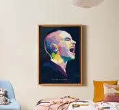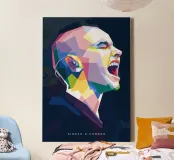 Ein lebhaftes und geometrisches Porträt von Sinead O'Connor im WPAP-Stil mit kühnen, kantigen Formen und einer auffälligen Reihe heller, kontrastreicher Farben. Das Kunstwerk fängt ihre ikonischen Merkmale, wie ihren rasierten Kopf, ihre stechenden Augen und ihren starken Gesichtsausdruck, mit scharfen, fragmentierten Farbblöcken ein. Die Komposition betont Tiefe und Emotionen und behält gleichzeitig die unverwechselbare kubistische Pop-Art-Ästhetik von WPAP bei, wodurch eine visuell dynamische und moderne Hommage an die legendäre Sängerin entsteht.