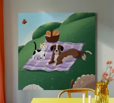 Hunde und Katzen spielen und jagen sich gegenseitig auf einer Wiese. Die leuchtenden Farben und dynamischen Posen vermitteln ein Gefühl von Spaß und Energie.