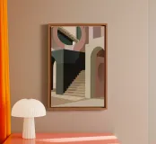 Ein abstrakter architektonischer Raum wird durch eine strenge Treppe und sich überlappende Bögen definiert, wobei ein dramatisches Spiel von Licht und Schatten eine kraftvolle, minimalistische Komposition schafft.
