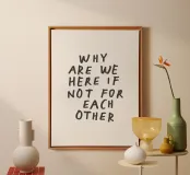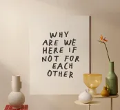 Bringen Sie Wärme und Verbundenheit in Ihren Raum mit diesem Kunstdruck, der den herzlichen Satz "Why Are We Here if Not for Each Other" in charmant grober, unschuldiger Handschrift zeigt. Vor einem sanften beigen Hintergrund zelebriert dieses Werk Freundlichkeit, Zusammengehörigkeit und die Schönheit der Unvollkommenheit. Dieser Druck eignet sich perfekt als Geschenk oder als aufmerksame Dekoration für Ihr Zuhause und passt in Wohn- und Schlafzimmer sowie in kreative Räume. Als sanfte Erinnerung an Einfühlungsvermögen und Einigkeit ist es ideal für Geburtstage, Jahrestage oder einfach, um geliebten Menschen eine Freude zu machen.