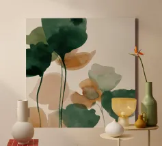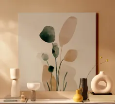 Eine zarte Komposition aus Eukalyptusblättern in weichen, durchscheinenden Erdtönen. Dieses abstrakte, minimalistische botanische Kunstwerk vermittelt ein Gefühl von Ruhe und Achtsamkeit und eignet sich perfekt für moderne, von Wellness inspirierte Innenräume.