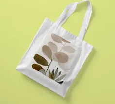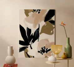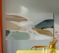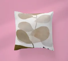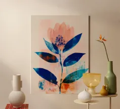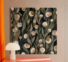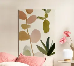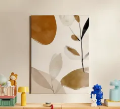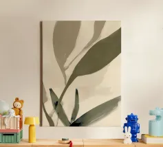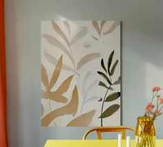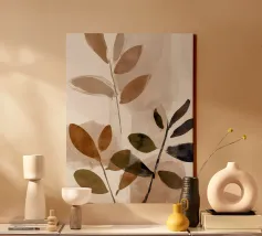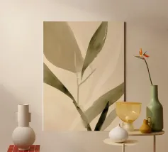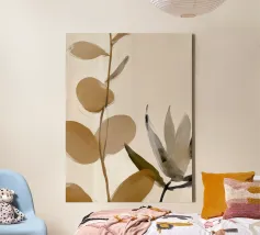 Eine zarte Komposition aus Eukalyptusblättern in weichen, durchscheinenden Erdtönen. Dieses abstrakte, minimalistische botanische Kunstwerk vermittelt ein Gefühl von Ruhe und Achtsamkeit und eignet sich perfekt für moderne, von Wellness inspirierte Innenräume.
