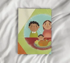 Die fröhliche Illustration zeigt einen Cartoon-Truthahn in sanften Pastellfarben, umgeben von herbstlichen Elementen.