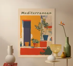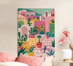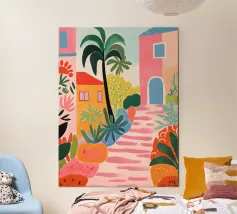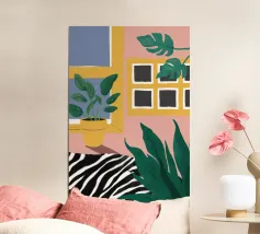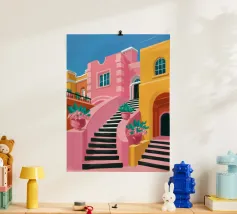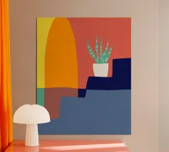 Eine abstrakte Illustration zeigt eine farbenfrohe Treppe, die mit einer Vielzahl von Topfpflanzen geschmückt ist und Architektur und Botanik in einer lebendigen, modernen Komposition vereint.