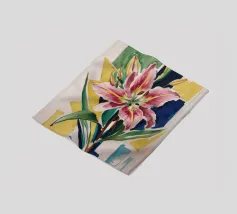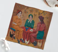 Dieses Kunstwerk zeigt eine Person, die auf einem gestreiften Stuhl sitzt, umgeben von Sonnenblumen und einer grünen Tasche. Der Hintergrund ist ein gedämpftes Braun, das eine rustikale und nachdenkliche Atmosphäre schafft.