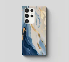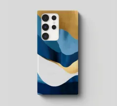 Dieser elegante, abstrakte Hintergrund zeigt fließende Gold- und Silberelemente mit kreisförmigen Akzenten auf einer sattblauen Leinwand und sorgt so für eine beeindruckende visuelle Wirkung, die sich für kreative Projekte eignet.