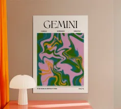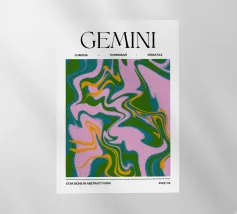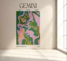 Ein lebhaftes Design zum Thema Zwillinge mit einem energiegeladenen und fließenden abstrakten Muster, das die lebhafte, neugierige und anpassungsfähige Natur des Sternzeichens Zwillinge einfängt. Mit einer kühnen und doch luftigen Farbpalette spiegelt dieses Kunstwerk die Dualität der Zwillinge, ihre schlagfertige Energie und ihre Liebe zur Kommunikation wider. Perfekt für Astrologie-Liebhaber, Horoskop-Enthusiasten und alle, die sich für ausdrucksstarke, auffällige Kunst interessieren. Ideal für Wanddekoration, Poster, Kleidung und mehr!