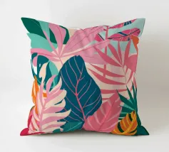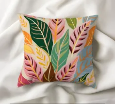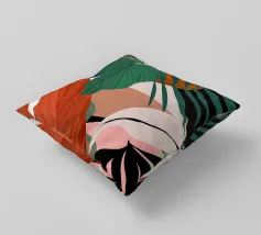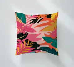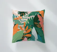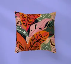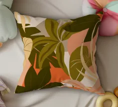 Dieses lebendige Kunstwerk zeigt eine dynamische Komposition aus tropischen Blättern in kräftigen, kontrastreichen Farben. Das Werk zeigt eine Mischung aus tiefgrünem, zartrosa und leuchtend orangefarbenem Blattwerk mit komplizierten Adermustern, die Textur und Details hinzufügen. Das Zusammenspiel von warmen und kühlen Tönen sorgt für ein lebendiges, energiegeladenes Gefühl, während der klare, cremefarbene Hintergrund die Blätter gut zur Geltung kommen lässt. Der stilisierte, grafische Ansatz verleiht dem Kunstwerk eine moderne und verspielte Ästhetik, die die üppige Schönheit der Natur in einem zeitgemäßen Design hervorruft.