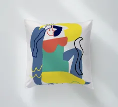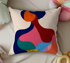 Eine stilisierte abstrakte Komposition mit sich überschneidenden Formen in leuchtenden Farben, die den Eindruck einer sitzenden Person vermitteln. Die kräftige Verwendung von Blau, Rot, Orange und Grüntönen erzeugt ein dynamisches Gefühl von Bewegung und Form.