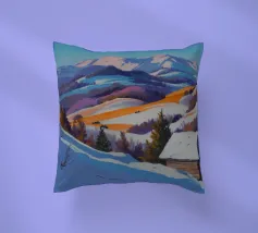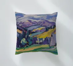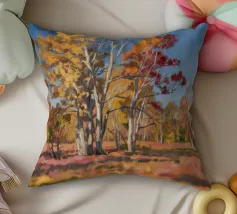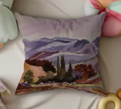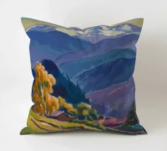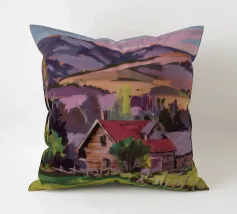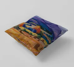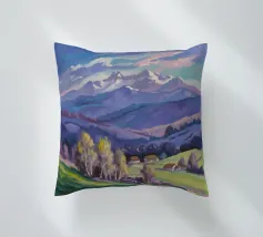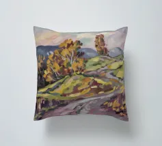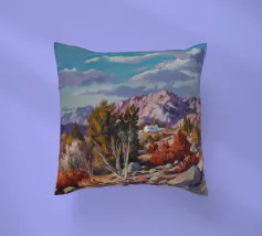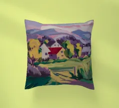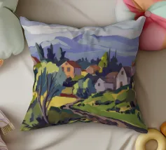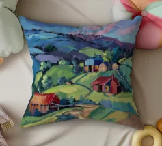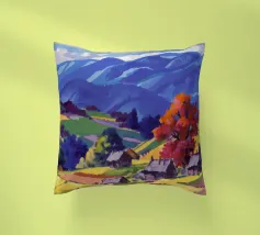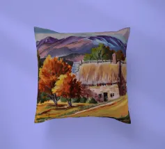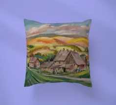 Eine malerische Herbstlandschaft, die ein Dorf oder einen Bauernhof auf einem Hügel zeigt, umgeben von einem Flickenteppich aus bunten Bäumen in Orange- und Gelbtönen und bewirtschafteten Feldern, wobei die blauen Berge in der Ferne die Szene abrunden.