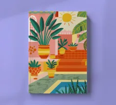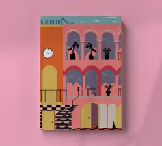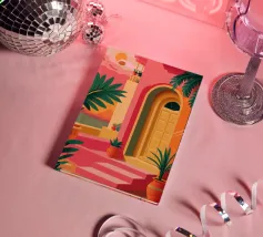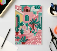 Eine leuchtend rote Treppe führt durch ein farbenfrohes, vereinfachtes Gebäude hinauf zu einem üppigen, gewölbten Eingangsbereich, der eine Reise zu einem schönen und exotischen Ziel suggeriert.