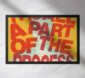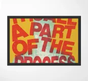 "Die Phrase IS ALL A PART OF THE PROCESS' ist in einem dynamischen, leicht chaotischen Layout mit roter Typografie in Notlage vor einem strukturierten gelben Hintergrund angeordnet, mit einer subtilen Silhouette hinter dem Text. Die raue Textur und die unvollkommenen Buchstabenformen vermitteln ein Gefühl von Authentizität und Widerstandsfähigkeit.",