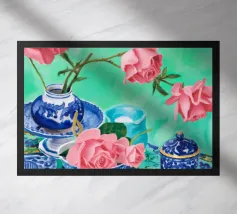 Ein lebhaftes Stillleben mit einer blau-weiß gemusterten Vase, die mit blauen Hortensien und anderen Blumen überquillt, mit Schmetterlingen vor einem hellen türkisfarbenen Hintergrund.
