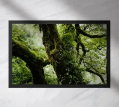 Die Rinde eines großen Baumes ist mit leuchtend grünem Moos bedeckt, das von verschlungenen Ästen umrankt wird und die ruhige Atmosphäre eines Waldes im frühen Morgenlicht widerspiegelt.